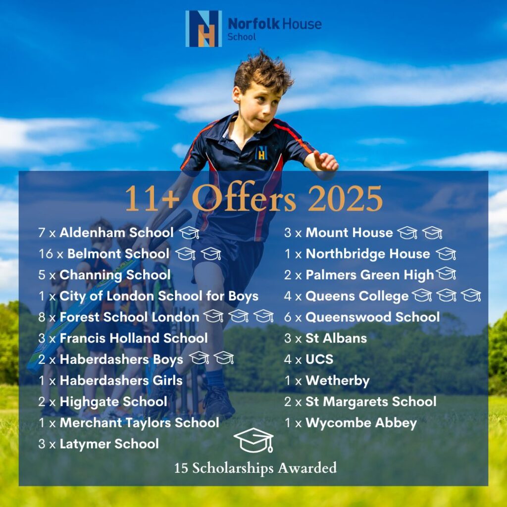 Our close relationships with senior schools, combined with our deep understanding of each child as an individual, guide our discussions with parents and ensure that every pupil applies to the school best suited to them. We take pride in the strong academic foundation we provide, and Norfolk House pupils consistently receive offers from some of the country’s most prestigious schools.